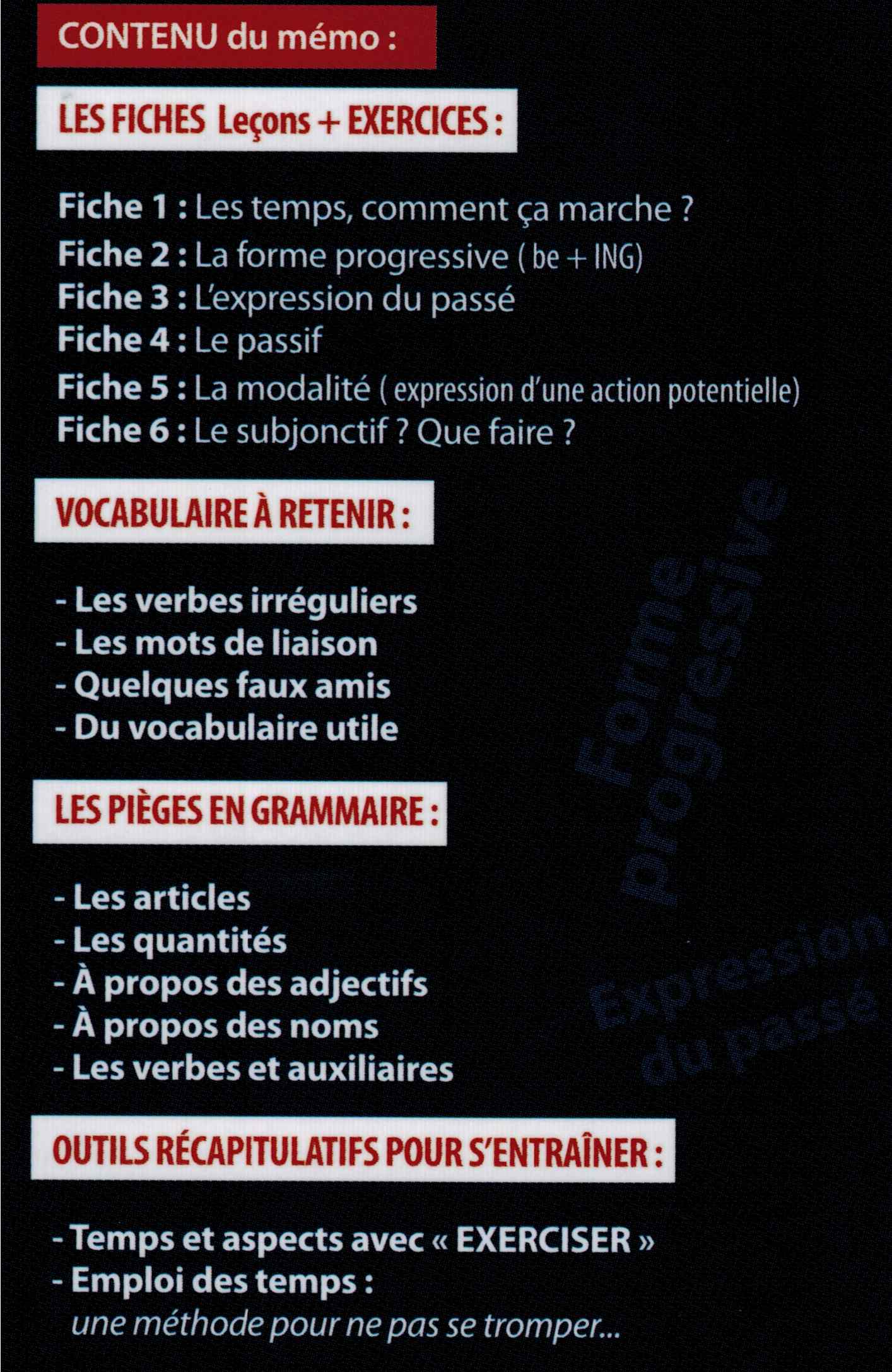 Je n'ai évidemment rien inventé. J'ai essayé de faire court et simple.J'ai seulement tout rangé de manière à dégager 6 notions importantes qui nécessitent qu'on s'y attarde parce qu'elles remettent en question notre manière de penser. Cela se présente sous la forme de 6 fiches principales accompagnées d'exercices pratiques nécesssaires à notre quotidien à l'oral comme à l'écrit. Cela doit permettre de se sentir à l'aise. Ensuite on trouvera une partie intitulée "Quelques pièges en Grammaire", qui est en fait un répertoire des fautes préférées des Français, ne nécessitant que de courtes explications. Il faudra aussi apprendre ces fameux verbes irréguliers qui ne sont en fait pas si nombreux et bien peu de chose comparés à nos verbes et à notre conjugaison. On trouvera enfin une liste des Faux Amis et des mots de liaison ainsi qu'un vocabulaire utile. Il ne s'agit pas de tout apprendre par coeur mais de comprendre comment ça marche et de savoir où trouver les renseignements.